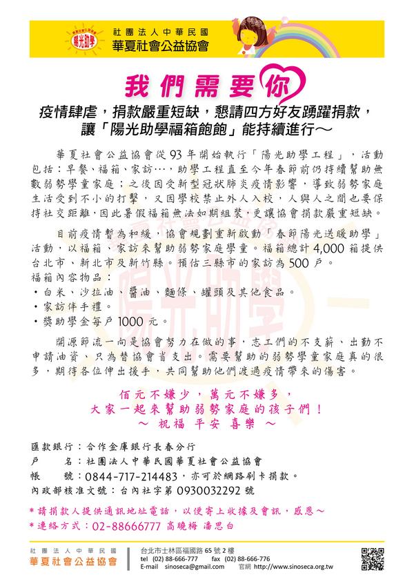 華夏社會公益協會從2004年開始執行「陽光助學工程」,包括:早餐、福箱、家訪…,持續幫助無數弱勢學童家庭;今年春節過後因受新冠肺炎疫情影響,衝擊弱勢家庭生活,又因社交距離之故,因此暑假福箱無法如期組裝,新冠肺炎也讓協會捐款嚴重短缺。